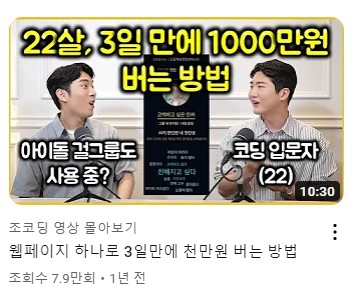 아마 처음 본 영상이 위의 영상이었던 것 같다. 다소 자극적인 제목에 영상을 시청하게 됐다. 영상에서는 요즘 시대가 코딩하기에 좋은 인프라가 매우 많고, 입문자도 접근하기 좋다는 내용이었다. 거기에 대박 난다면 돈까지 벌 수 있다고 말이다. 사실 어느 정도 일부의 성공사례가 과장되어 편향되었을 거라 생각한다. 하지만 이 내용에서 얻을 수 있는 교훈이 있었다.