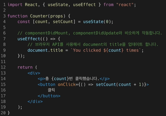 - 결국, componentDidMount, componentDidUpdate와 비슷한 기능을 하는 것 - 이펙트는 함수 컴포넌트 안에서 선언되기 때문에 해당 컴포넌트의 props와 state에 접근할 수 있음