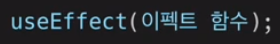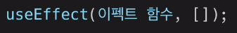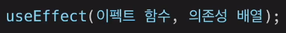 두 번째 파라미터 : 의존성 배열(이펙트가 의존하고 있는 배열, 배열 안에 있는 변수 중에 하나라도 변경되었을 때 이펙트 함수 실행) - 이펙트 함수 : 처음 컴포넌트가 렌더링 된 이후와 업데이트로 인한 재렌더링 이후에 실행