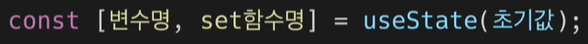 - 함수 컴포넌트에서는 기본적으로 state를 제공하지 않기 때문에 class 컴포넌트처럼 state를 사용하고 싶으면 useState hook을 사용해야 한다.