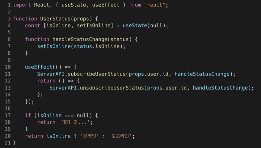 - useEffect에서 서버API를 사용하여 사용자의 상태를 구독하고 있음