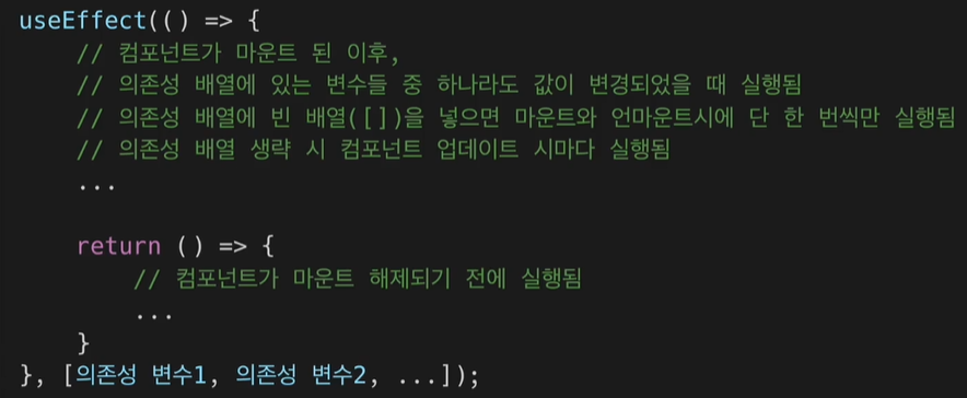 의존성 배열에 있는 변수들 중 하나라도 값이 변경되었을 때 실행됨