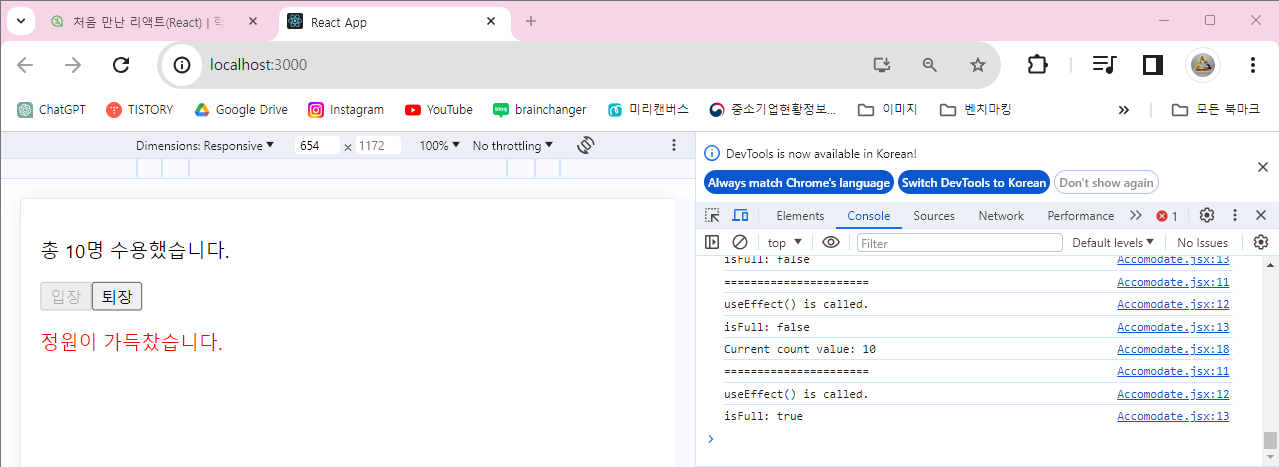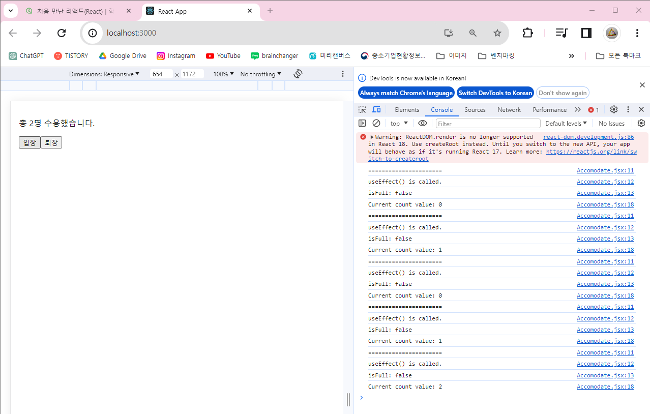 - 의존성 배열 없이 useEffect를 사용했기 때문에 React는 DOM이 변경된 이후에 이펙트 함수를 실행하라는 의미로 받아들임