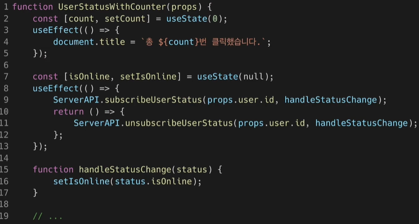 - useEffect에서 서버API를 사용하여 사용자의 상태를 구독하고 있음