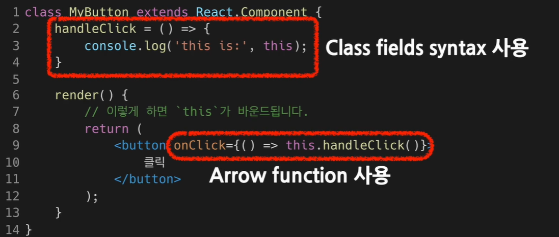 - Arrow function은 렌더링이 추가로 일어날 수 있기 때문에 성능 측면에서 바인딩이나 Class field syntax를 사용하는 것을 권장함.