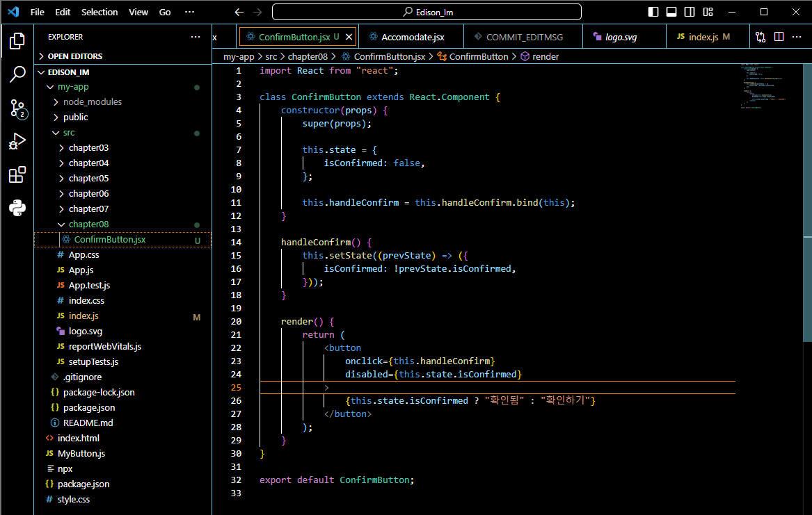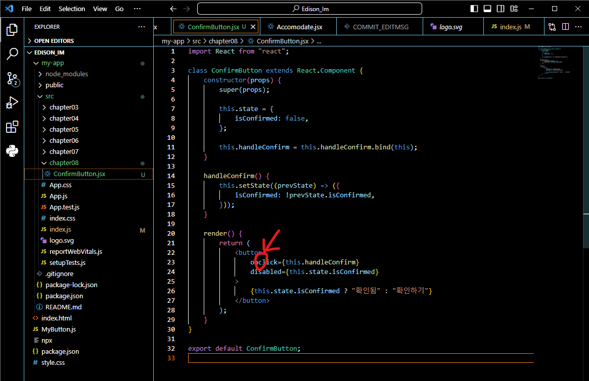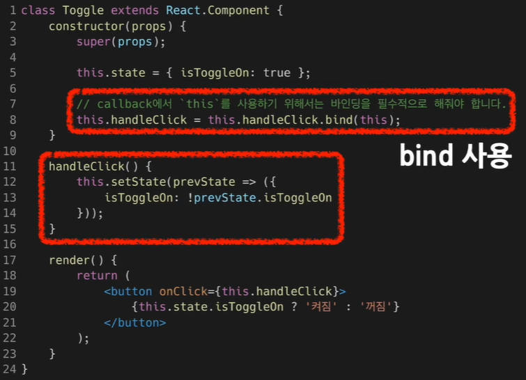 - JSX에서 this의 의미에 대해 유의해야 하는데 바인드를 하는 이유는 JS에서는 기본적으로 클래스 함수들이 바인드 되지 않기 때문