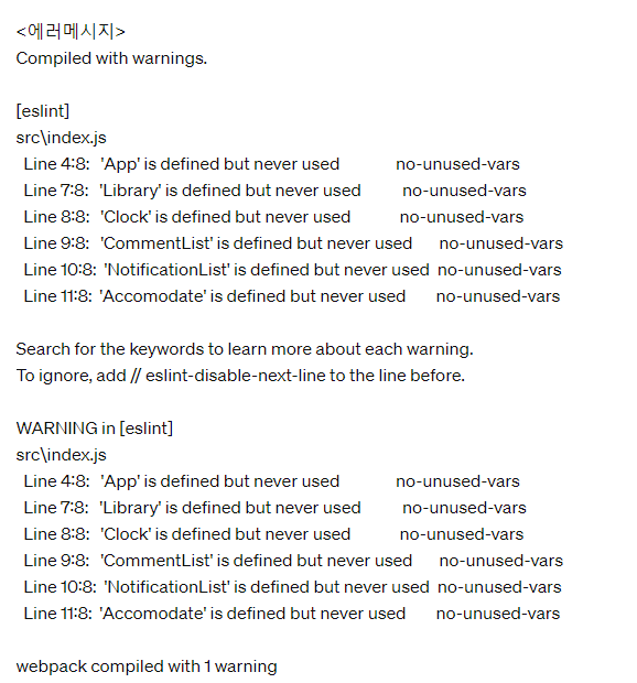 이런 에러였는데, 사용하지 않는 줄에 대해서 쓸데없으니 없애라는 것 같았다.