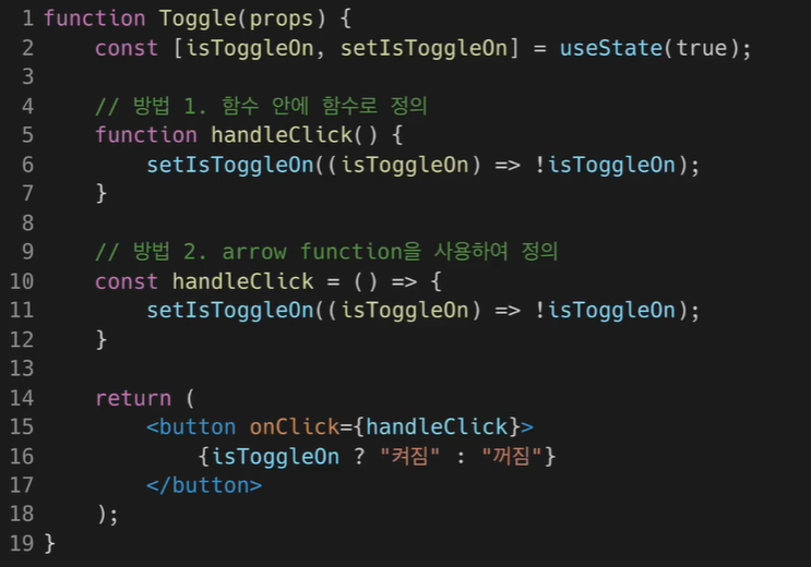 함수 컴포넌트 내부에서 이벤트 핸들러를 정의하는 방법은 두 가지가 있다.