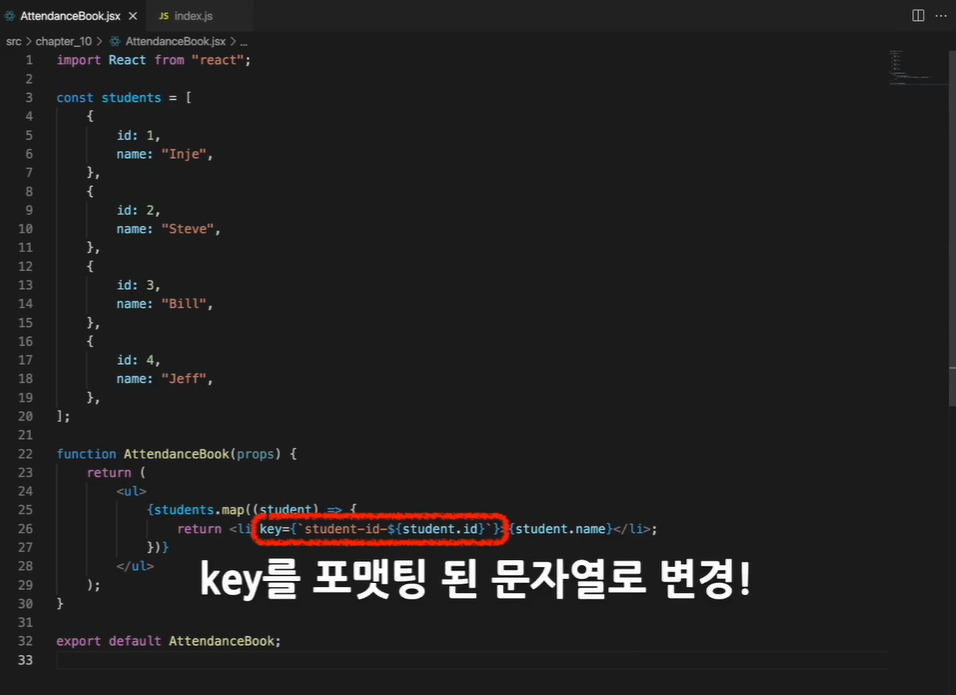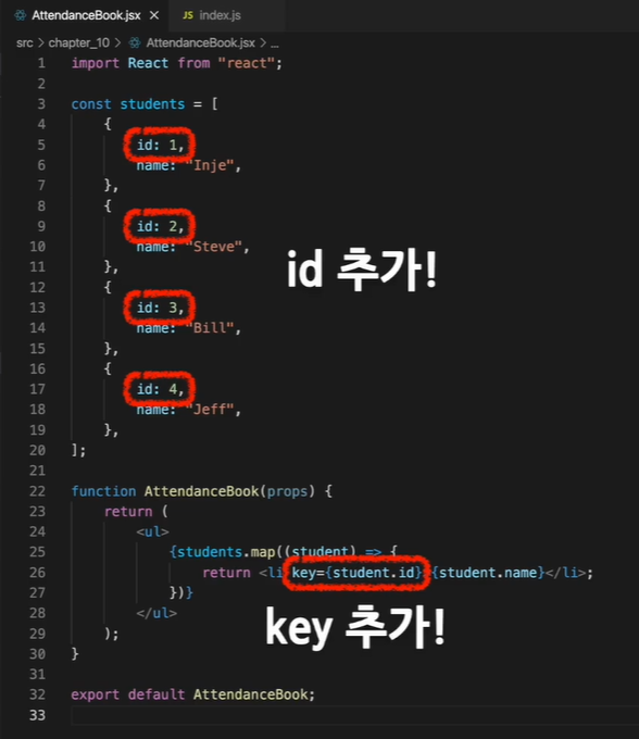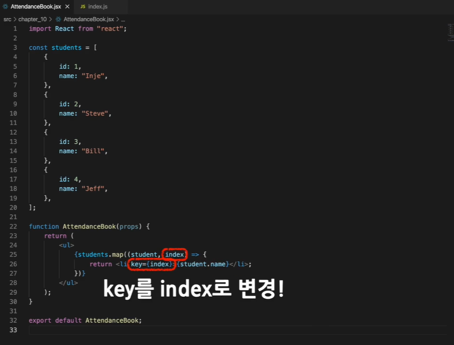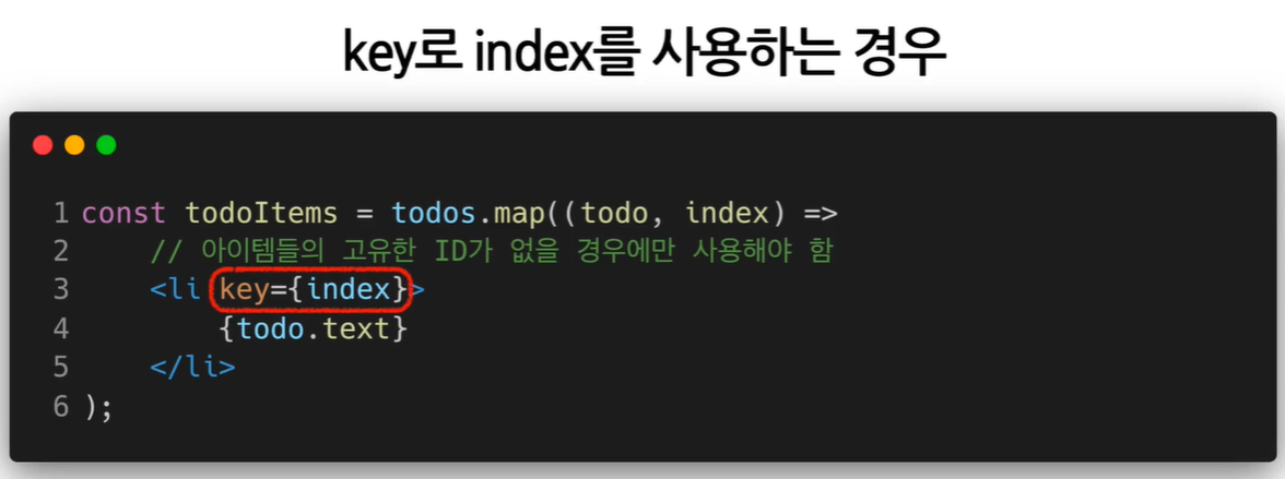 Key값으로 인덱스(순서)를 사용하는 것은 리스트 내에서 고유한 값이기는 하나 권장하지 않는다.