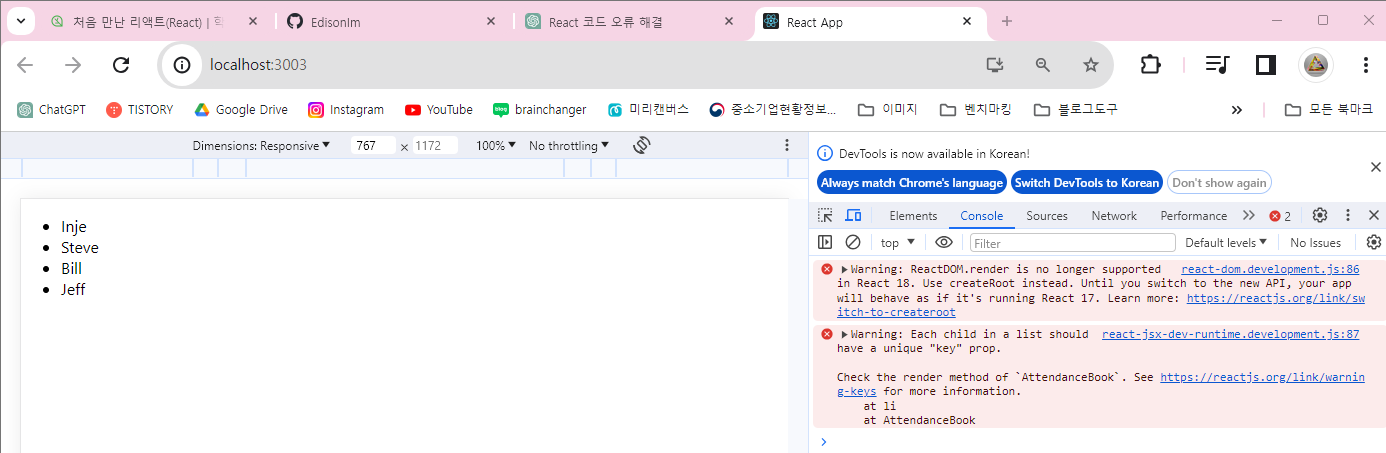 맵함수를 사용해서 리스트를 렌더링했는데 각 엘리먼트에 키가 빠져있기 때문