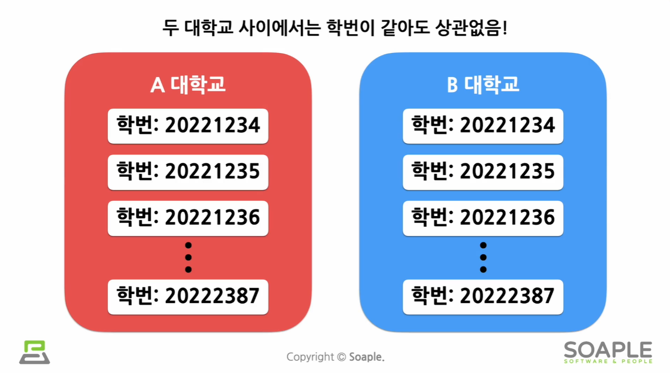 학번은 대학교 내에서 학생을 구분하기 위한 일종의 키이기 때문에 속한 집합 내에서만 고유한 값이면 됨.