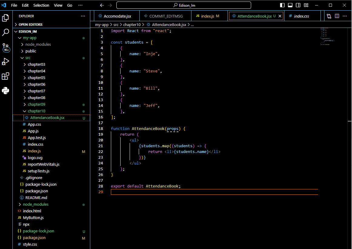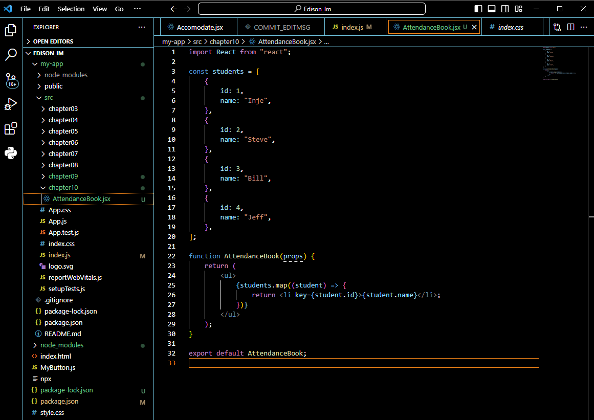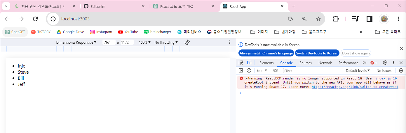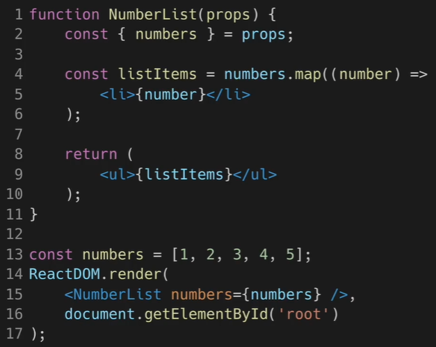 - NumberList 컴포넌트를 사용하면 numbers 배열의 숫자가 수십 개, 또는 수백 개가 되어도 별도의 코드를 작성할 필요가 없음 - 하지만 위대로 코딩하면 고유 키가 있어야 된다는 메시지가 뜸
