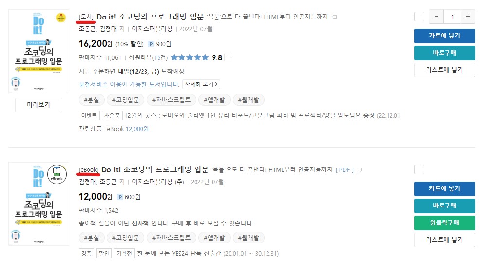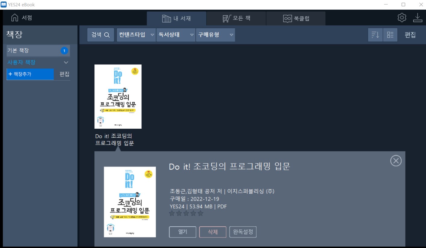 무슨 말이냐면, 유튜브로 코딩을 시작하게 해 준 사람이 책을 냈으니 감사의 의미 + 체계적으로 정리된 책이 있으면 좋겠어서 샀다. 다른 것 비교 안 하고 그냥 샀다. 최근에 태블릿 PC(갤럭시 탭 울트라)를 회사에서 준 김에 처음으로 전자책을 사봤다. YES24에서 샀다.
