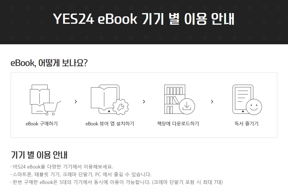 그리고 eBook은 5대 기기에서 이용가능해서 매우 편했다. 크레마 단말기 포함하면 7대까지 된다고 하니 기기별로 다 써도 넉넉하다.