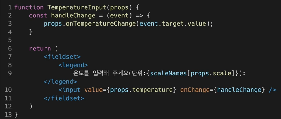 온도값이 변경되면 onTemperatureChange 함수를 호출하여 상위 컴포넌트로 변경된 값을 전달하게 됨