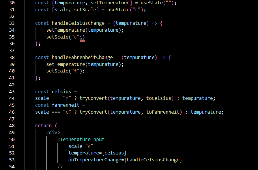 상위 컴포넌트인 Calculator에서 온도값과 단위를 각각의 state로 가지고 있으며 두 개의 하위 컴포넌트는 각각 섭씨와 화씨로 변환된 온도값과 단위, 그리고 온도를 업데이트하기 위한 함수를 props로 가지고 있음