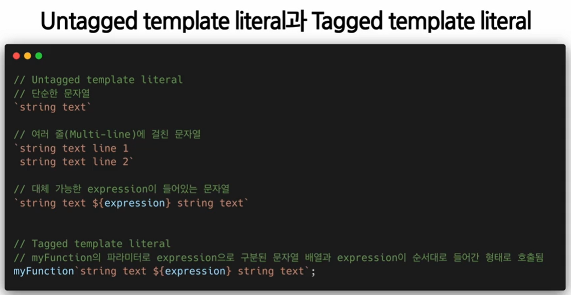 - Untagged Template Literal : 여러 줄에 걸친 문자열