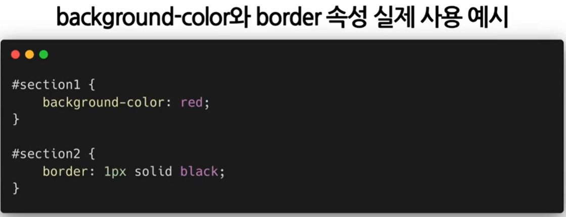 엘리먼트의 배경색을 빨간색으로 지정, 엘리먼트의 테두리를 1px 검은색 직선 지정