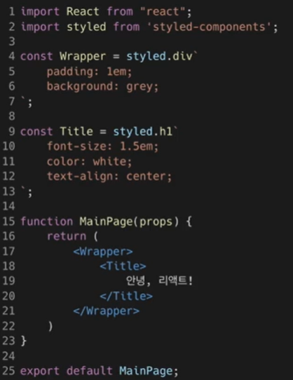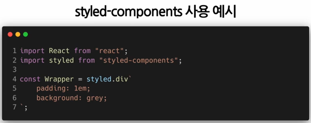 - 사용방법 : backticks(``)로 둘러싸인 문자열 부분에 CSS 속성을 넣고, 태그함수 위치에는 styled.html 태그 형태로 사용