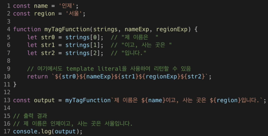 - Tagged Template Literal : 태그 Function을 호출하여 결과를 리턴