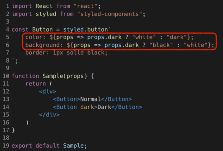 - 실제 버튼 컴포넌트를 사용하는 부분에서는 props로 dark를 넣어주는 것을 볼 수 있음