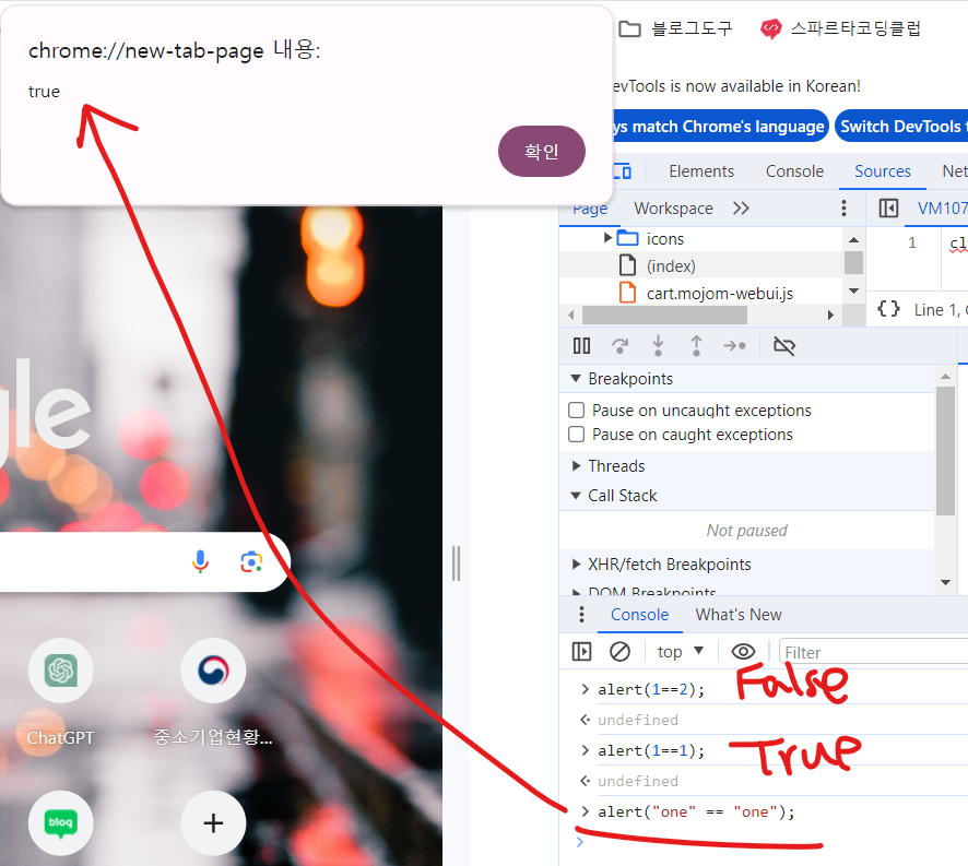 alert(1=="1") //true : 비슷하게 생긴 데이터의 외형은 같음