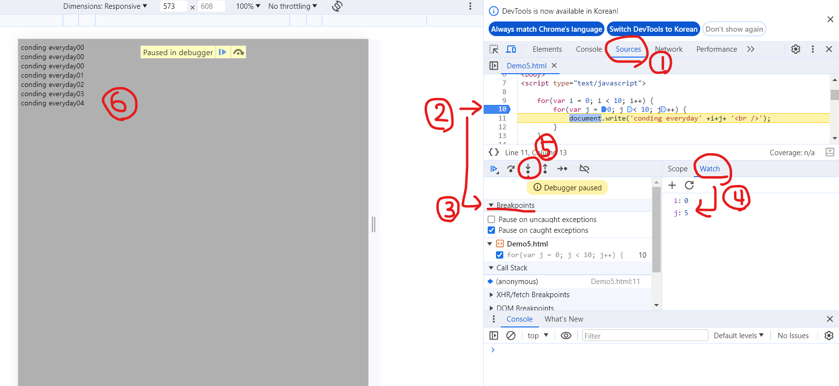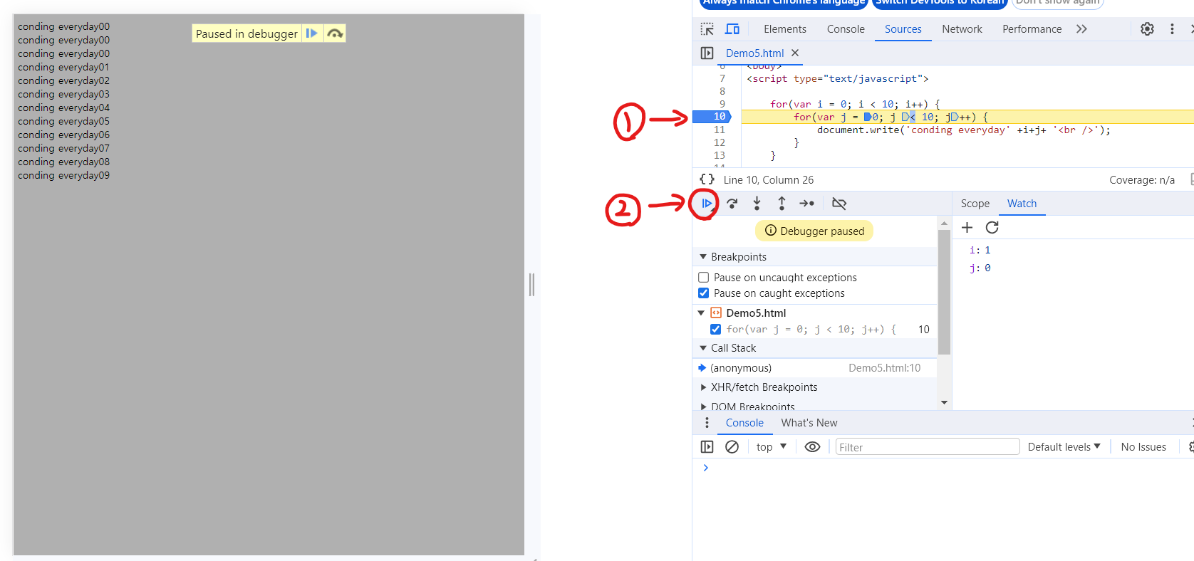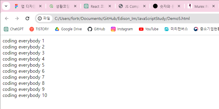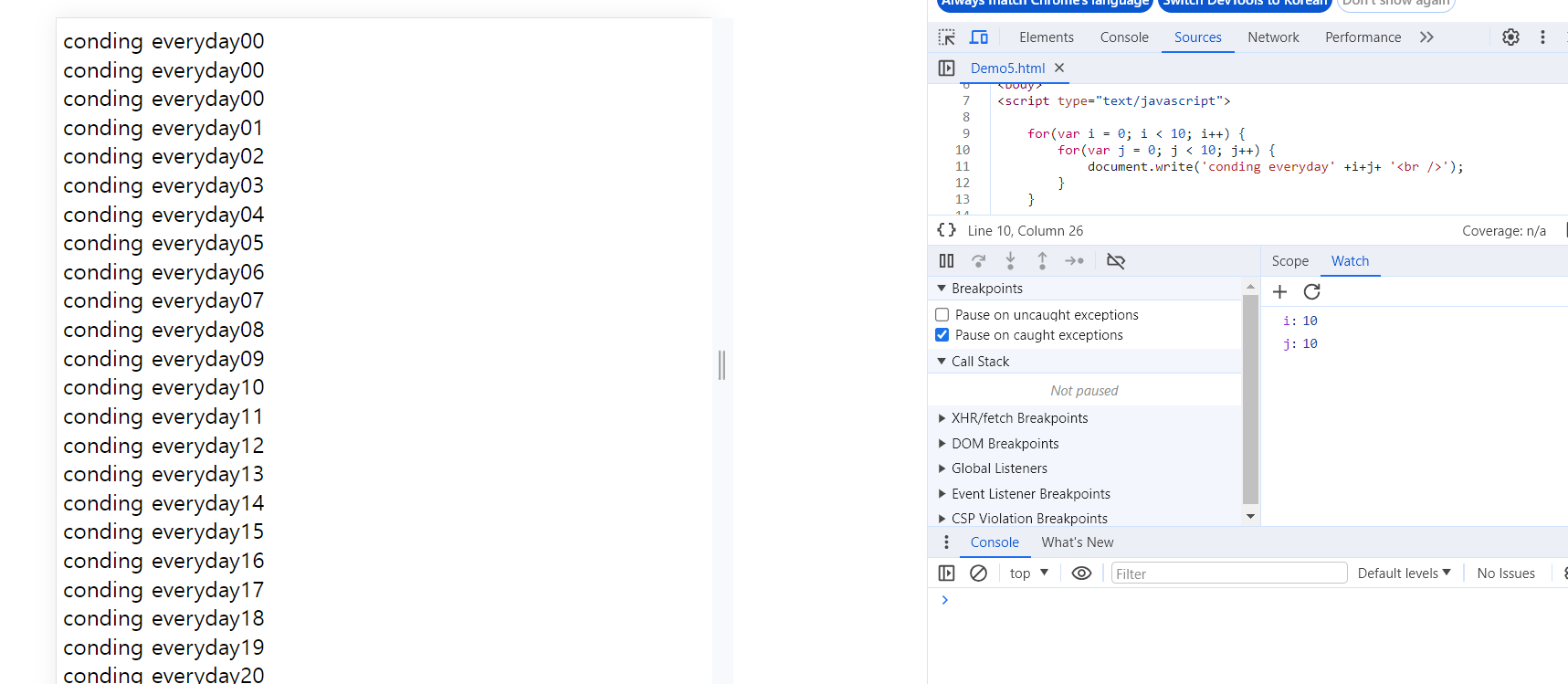 //기존코드 : document.write('coding everyday' +i+j+ '<br />');