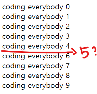 이 코드에서 i가 5가 되었을 때 continue를 만난다.