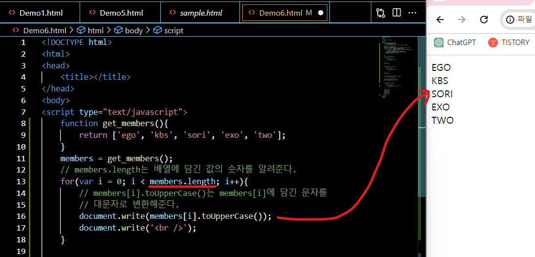alert(member); //ego, kbs, sori 출력 (index 미지정시) - 배열을 하면 순서대로 색인(index)이 알아서 생성됨
