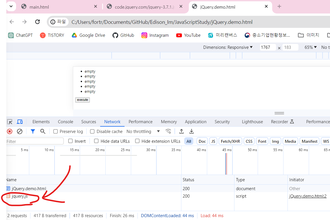 파일을 넣은 후에는 개발자도구에서 jquery.js가 생겼는지 확인