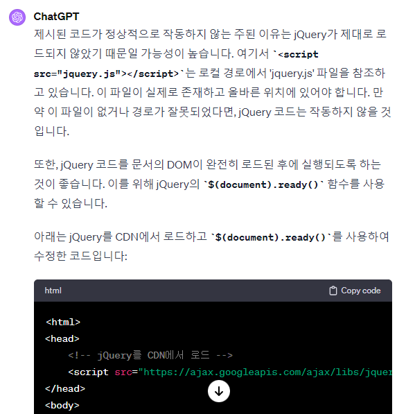 그래서 챗GPT에게 물어보니, jQuery가 제대로 로드되지 않았기 때문이라고 한다.