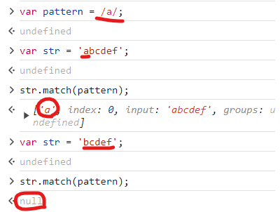 var pattern = /a/; //a가 들어간 걸 찾아줘! 를 패턴에 넣는 것