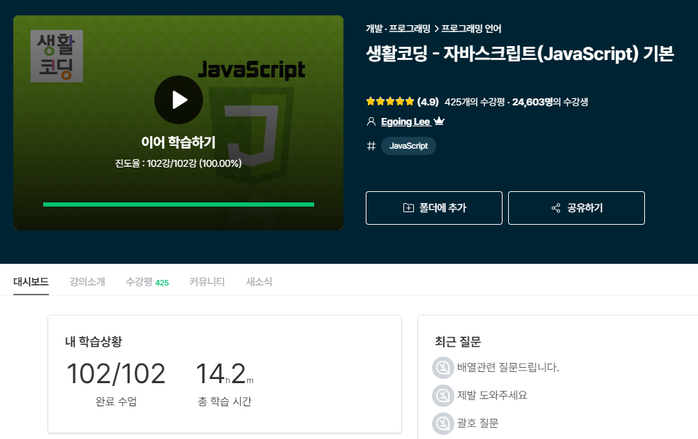 102개 강의에 14시간 수업이었지만 듣는데 쉽지는 않았다.