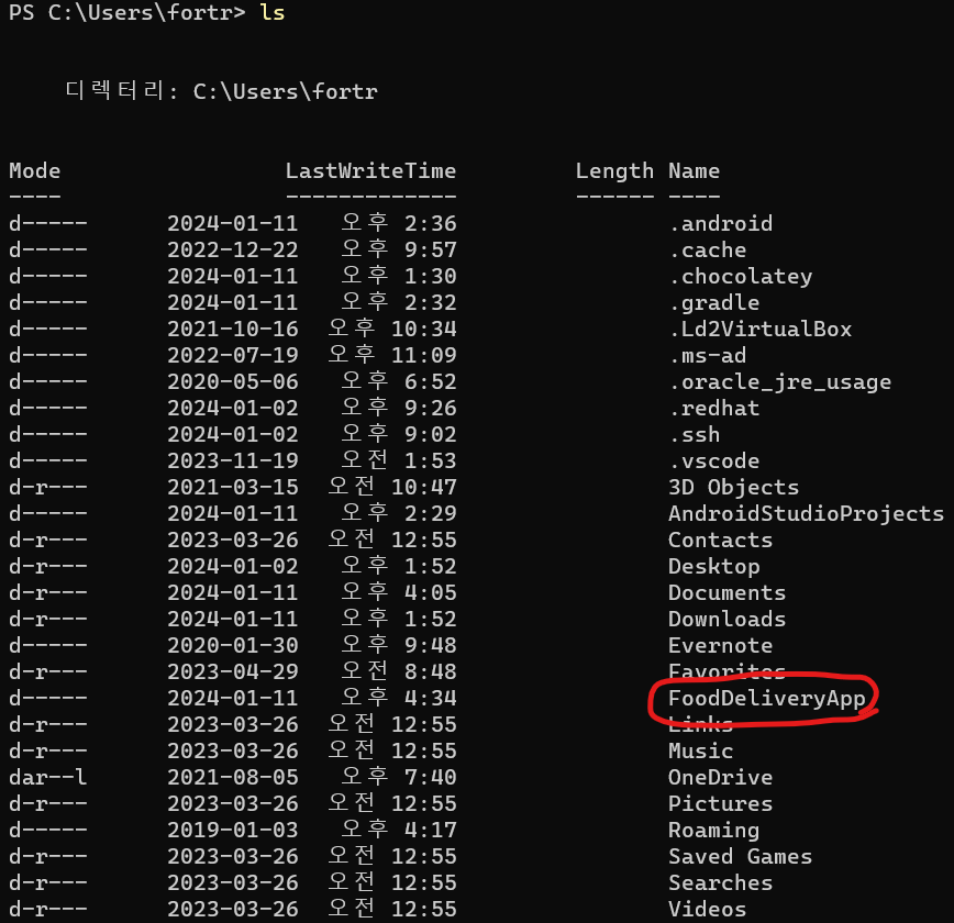 설치 후에 ls 명령어 입력 후 FoodDeliveryApp 뜨는지 확인