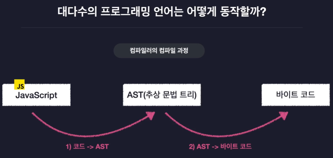 자바스크립트는 코드를 AST(추상적 문법 트리)로 바꾸고, AST를 바이트 코드로 바꾸면서 컴퓨터가 알아듣게 만듦.