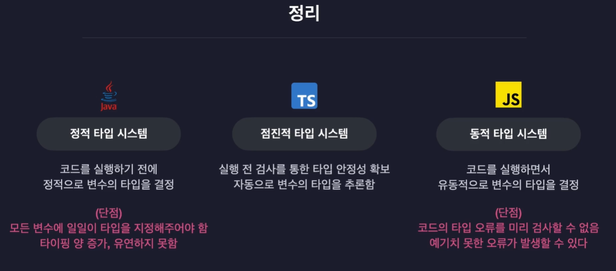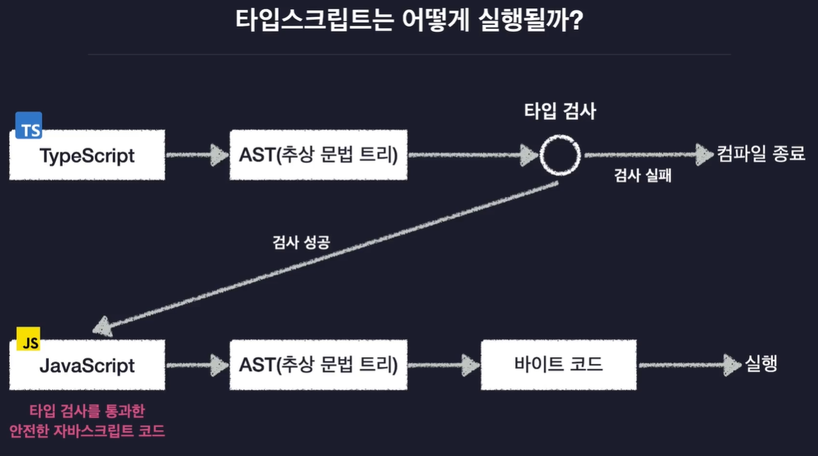 타입스크립트는 자바스크립트의 코드를 미리 검증하는 느낌으로 실행하기 때문에 더 안전하게 JS를 사용할 수 있는 것임.