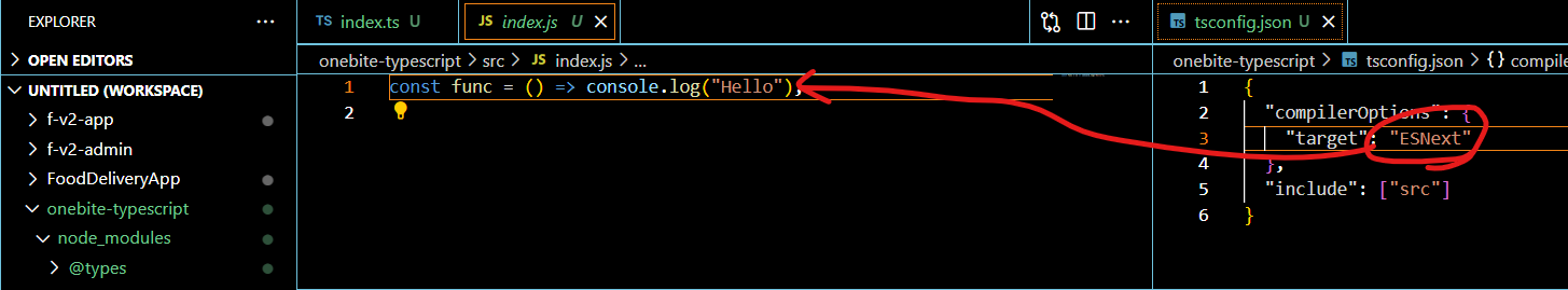 그래서 ESNext로 변경하면 자바스크립트의 최신 버전을 사용하기 때문에 화살표함수가 있다. 그래서 컴파일 이후에도 화살표함수로 나온다.