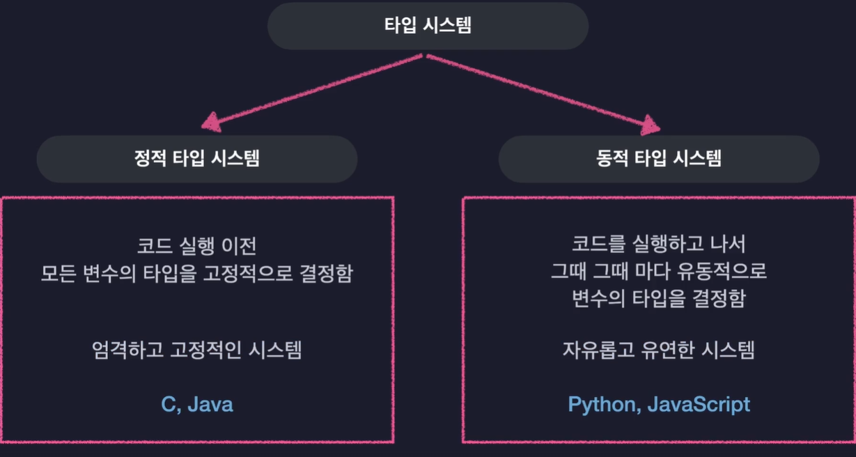 - 동적 타입 시스템으로 코드를 실행하면서 유동적으로 변수의 타입을 결정한다.