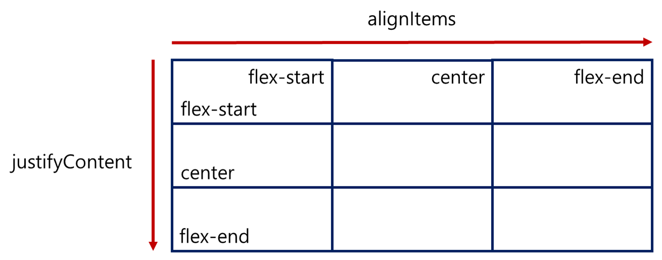 justifyContent는 행을, alignItems는 열을 기준이라고 생각하면 된다.