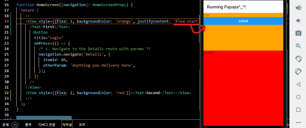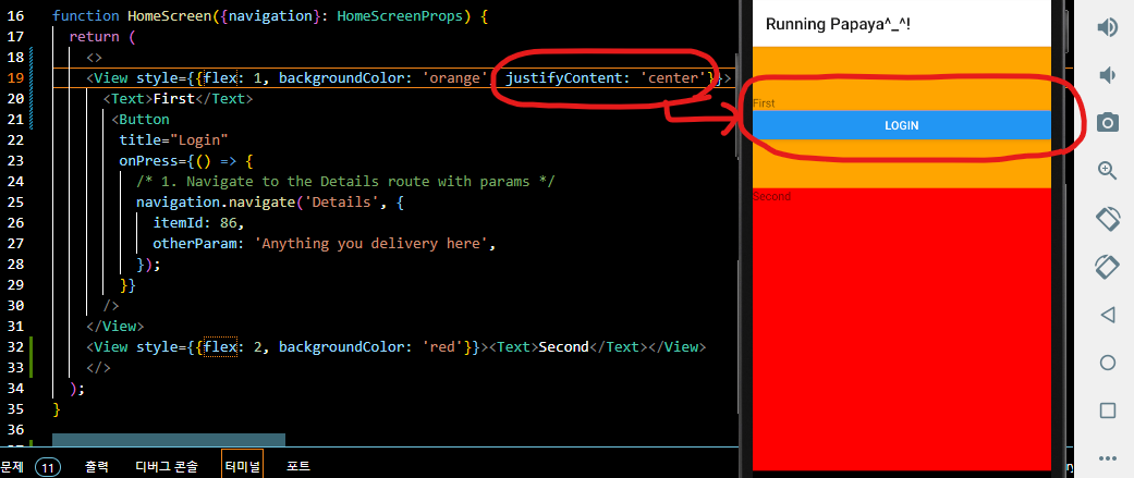 이렇게 쓰면 Login과 Second가 각각 flex가 1이므로 1:1로 화면이 나눠진다.