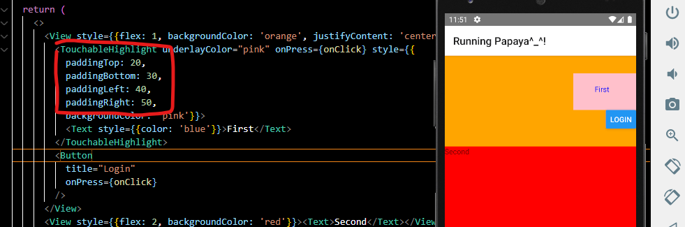 - TouchableHighlight : 클릭할 때 하이라이트가 됨(underlayColor로 하이라이트 컬러 조절 가능)
