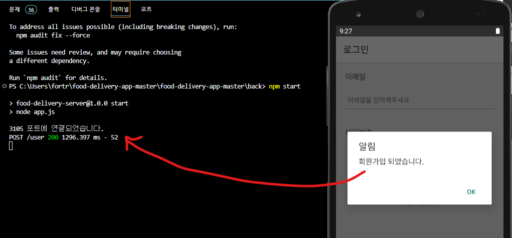 회원가입을 해봤더니 서버로 데이터가 들어왔다!