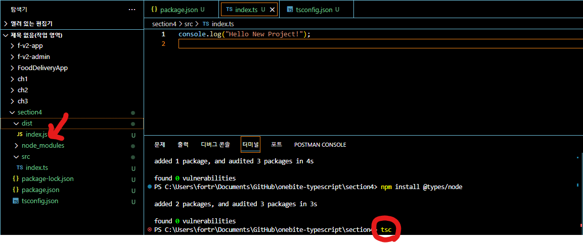 scr 폴더와 index.ts 파일 만들어서 간단히 코드 써주고 tsc 컴파일하면 dist 폴더에 index.js가 생긴다.