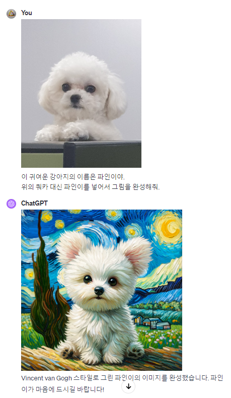 하지만 AI에게 일을 제대로 시키려면 그 또한 많이 배워야 한다. 챗GPT에게 일을 제대로 시키는 것을 프롬프트 엔지니어링(Prompt Engeneering)이라고 하는데, 최근에 IT 스타트업 뤼튼에서 프롬프트 엔지니어를 채용하면서 1억 원의 현상금(?)을 걸어서 화제가 되기도 했다. 지금은 프롬프트 엔지니어링이 나온 지 1년도 안된 상황이기 때문에 조금만 해도 연봉 1억 정도가 아니라 '프롬프트 엔지니어링의 아버지'가 될 가능성도 있다. 위의 이미지에서 필자는 프롬프트를 제대로 넣지 않았기 때문에 파인이의 모습이 살짝 다른 것을 볼 수 있다. 구체적으로 넣었으면 훨씬 비슷했을 것이다.
